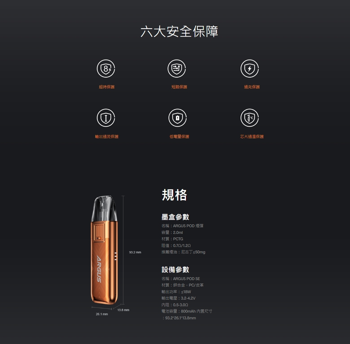 • 多層防漏設計:Argus SE 的 POD 煙彈採用了多層防漏技術,有效防止漏油,保持清爽的使用體驗。