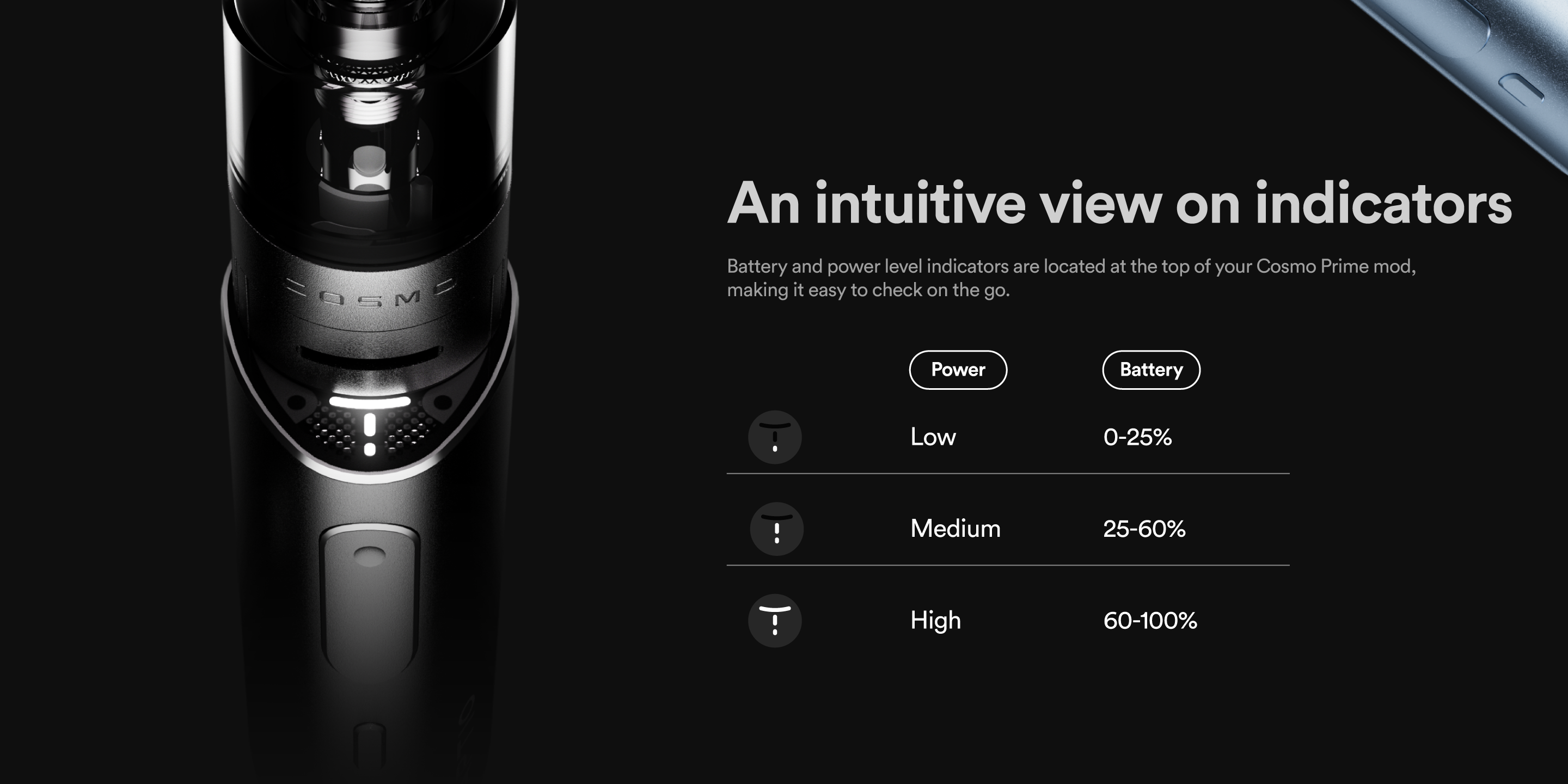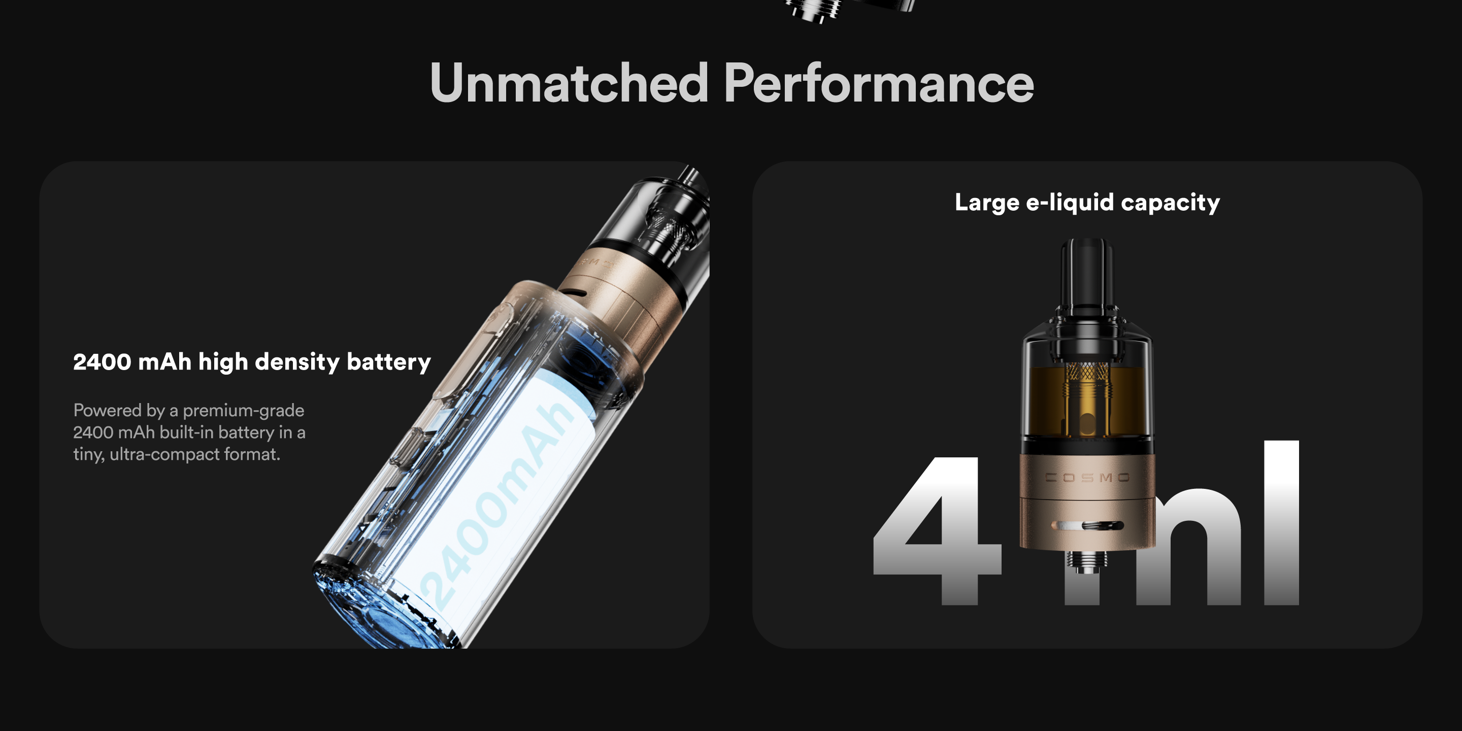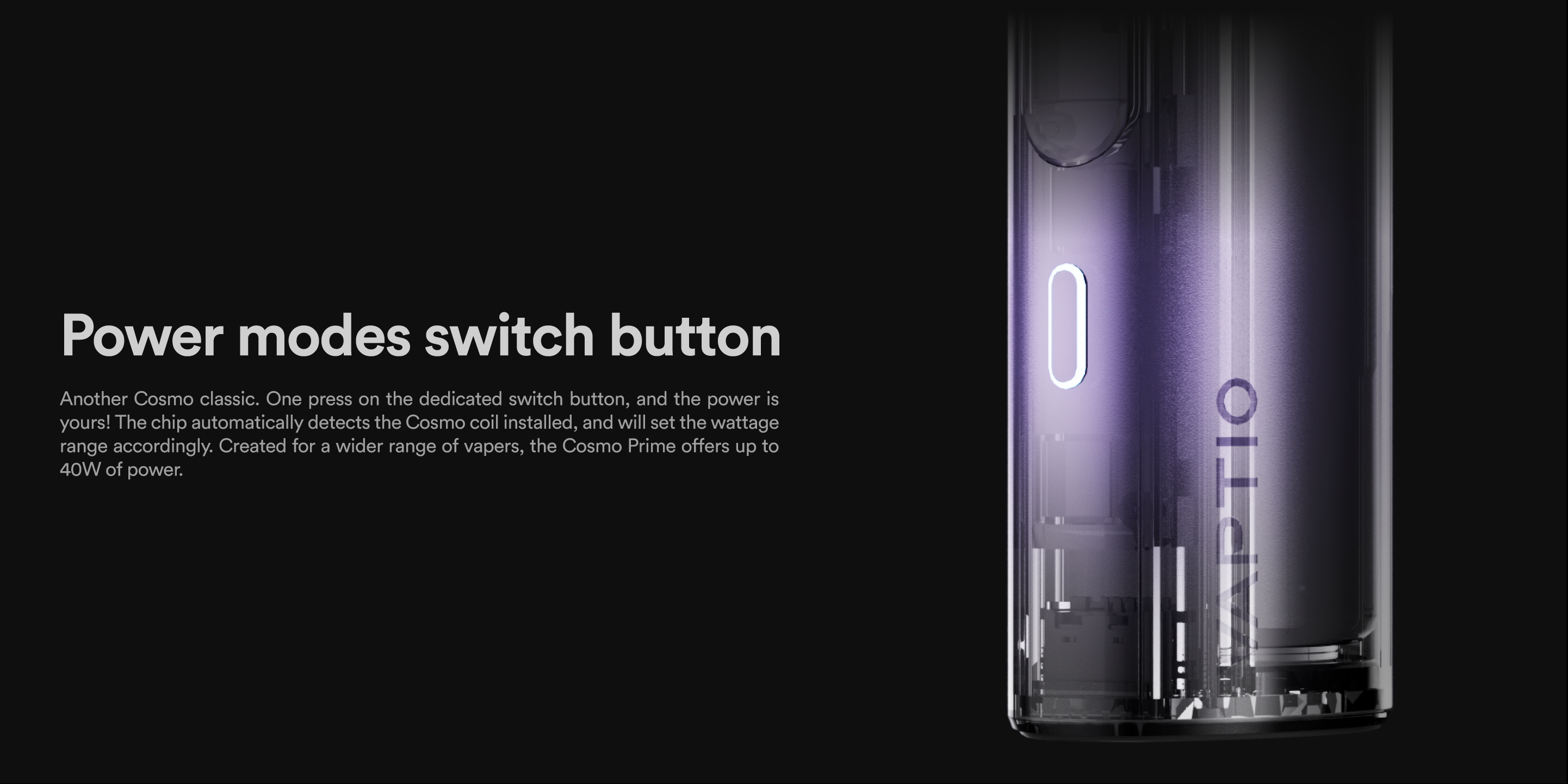 - 40W 最大輸出功率: Cosmo Prime 提供高達 40W 的輸出功率,確保強烈的風味和豐富的蒸氣。