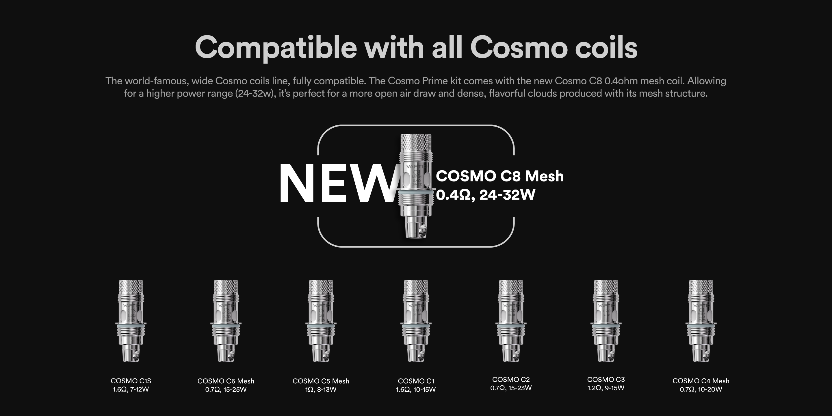 - 兼容多種霧化芯: Cosmo Prime 與多種霧化芯兼容,包括 Cosmo C5 和 Cosmo C8,滿足不同用戶的需求。