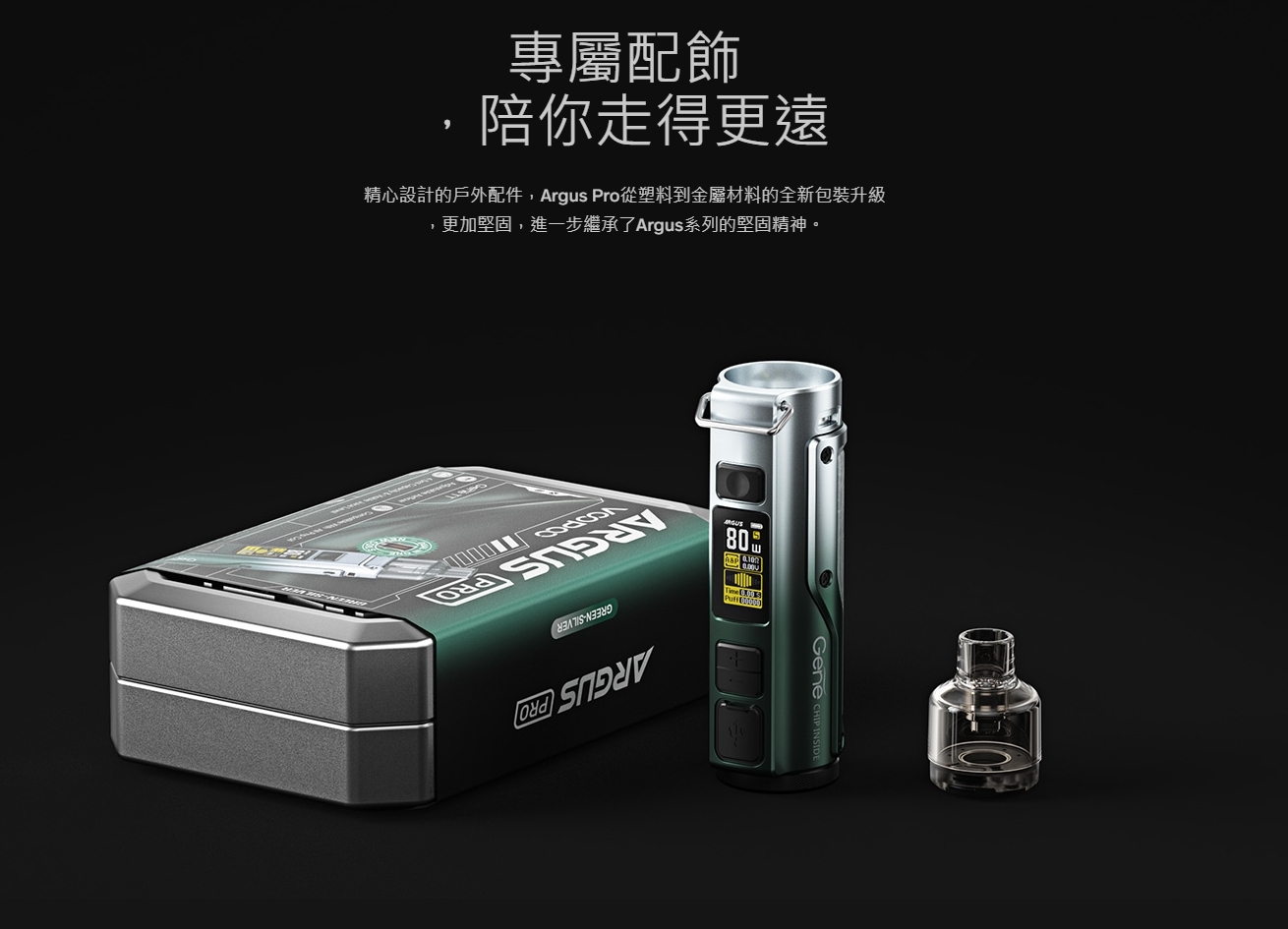 專屬配飾 ,陪你走得更遠精心設計的戶外配件,Argus Pro從塑料到金屬材料的全新包裝升級,更加堅固,進一步繼承了Argus系列的堅固精神。