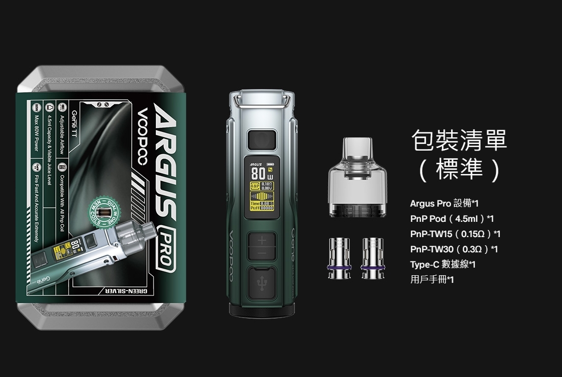 | VOOPOO ARGUS PRO | 北極藍套裝, 卡夢黑套裝, 綠銀套裝, 銀色套裝, 金紅漸層套裝, ARGUS PRO空艙(一盒2入), PnP-VM6 0.15(一盒五入), PnP-VM5 0.2(一盒五入), PnP-VM1 0.3 Ω(一盒五入), PnP-VM4 0.45Ω(一盒五入), PnP-M2 0.6Ω(一盒五入), PnP-TM2 0.8Ω(一盒五入), PnP-R1 1.0Ω(一盒五入), Argus pro 二代空倉(2 |