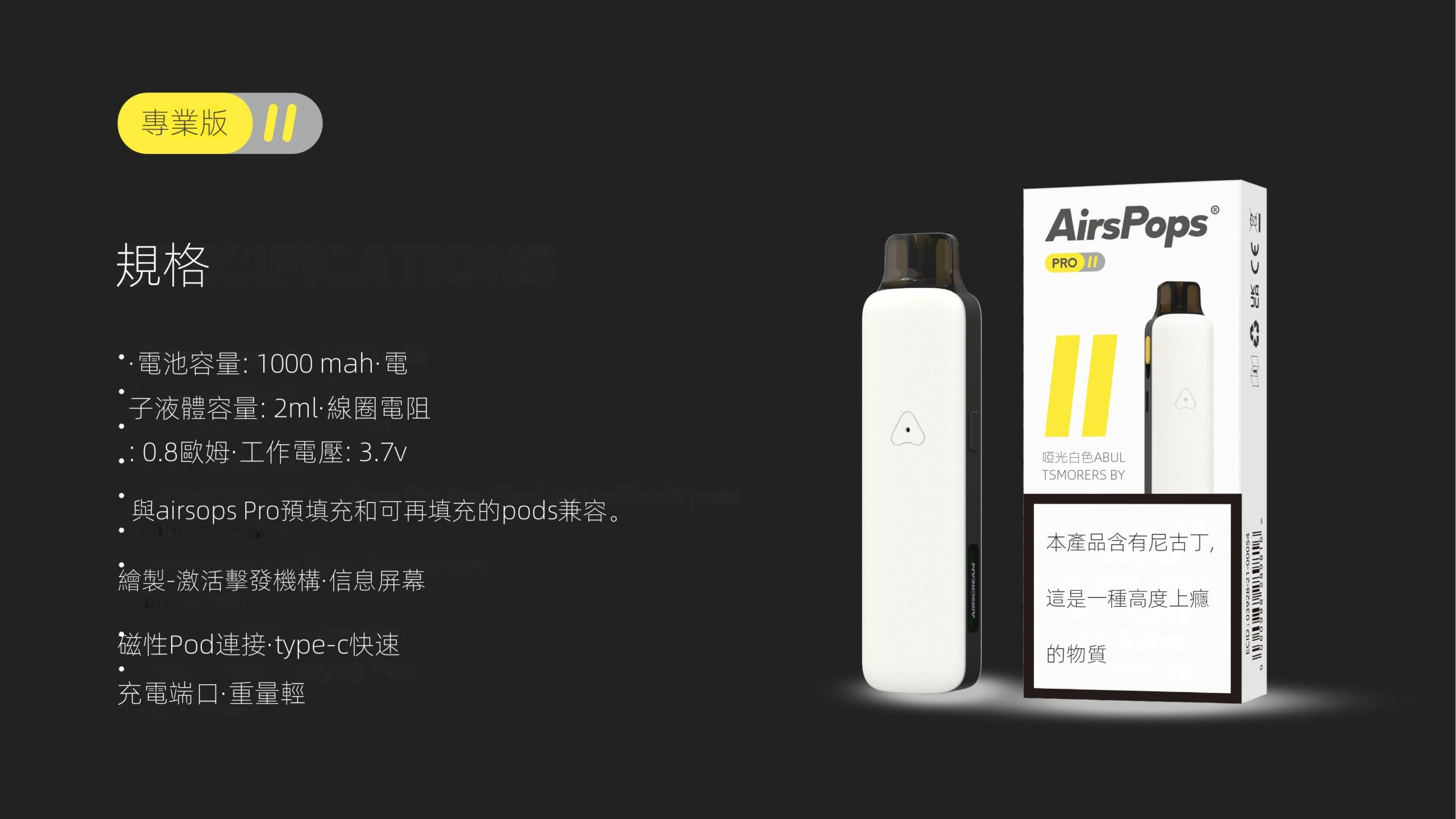 • 可更換煙彈系統: 與 AirsPops Pro 預填充和可填充煙彈兼容,易於使用和維護,滿足不同用戶的需求。