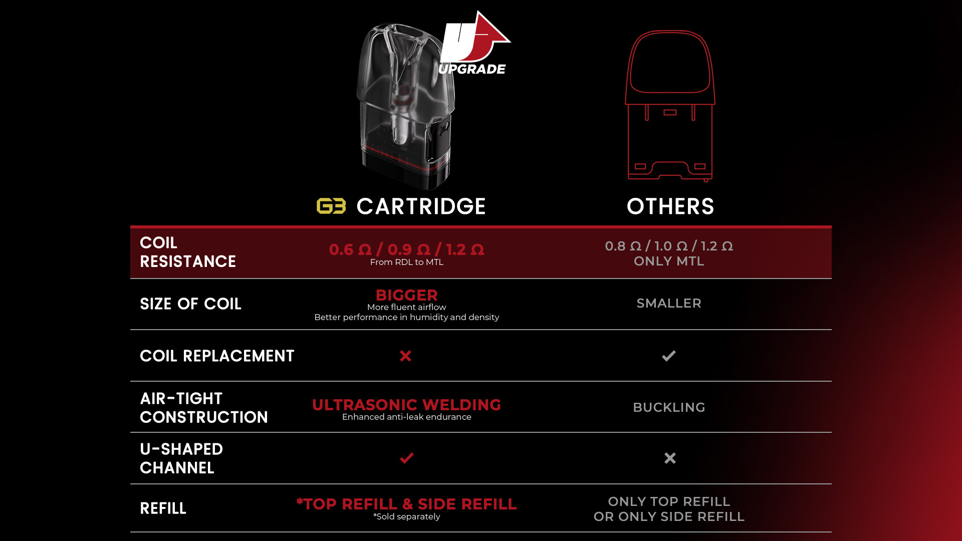 - 多樣化的線圈選擇: Caliburn G3 提供 0.6Ω、0.9Ω 和 1.2Ω 的線圈選項,滿足不同的吸食偏好。