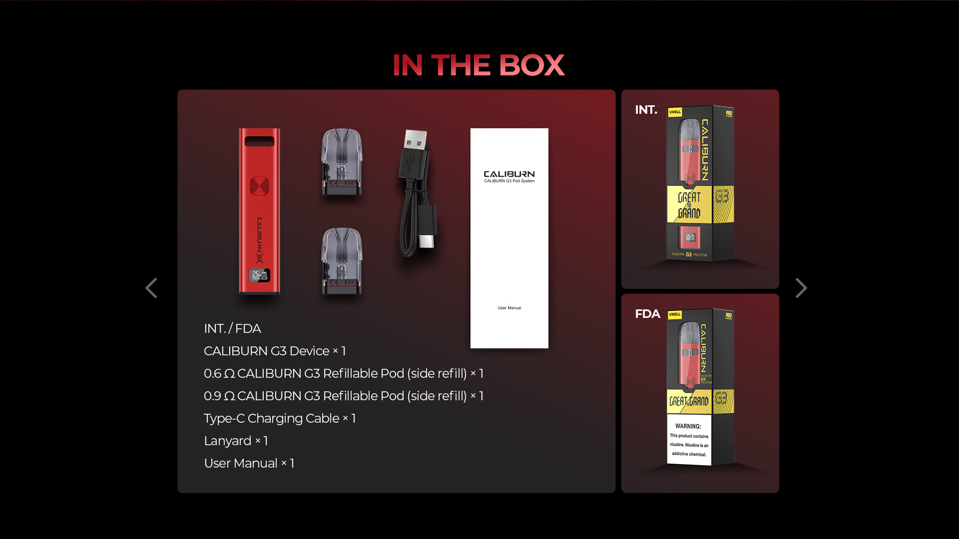 - 1 x 0.6Ω Caliburn G3 煙彈